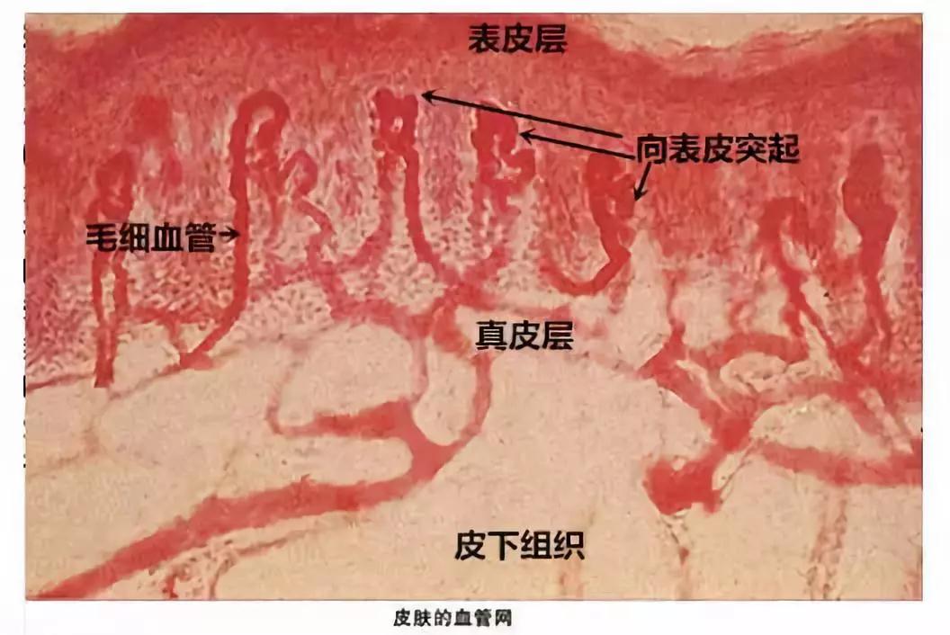 怕太专业你们会睡着,那简化来说—— 最下面的皮下组织其实就像肥沃的土壤一样,滋养整个真皮和表皮层,超级伟大,能量来源呢就是这一层的皮下脂肪,当然还有打酱油的毛囊。 然后真皮层,是个比较娇气的皮层,因为它没有再生能力,一旦受损,就很难修复: 里面有网状层和乳头层,包含血管,神经,淋巴管,汗腺和皮脂腺。乳头层和网状层就是保持皮肤弹性,皮脂腺和汗腺就是平衡肌肤的水油。 好了,重点来了,这一层有一个毛细血管,主要是把动脉和静脉连接起来。(如果你有红血丝,最好仔细看看它们)