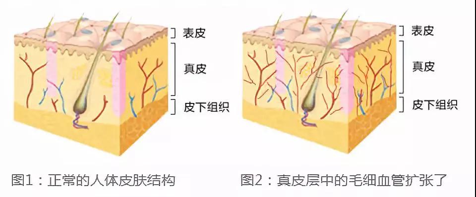 基底层:皮肤干细胞发生细胞分裂,负责提供新生的角质细胞,让皮肤更新; 有棘层:细胞之间流动淋巴液,提供皮肤养分,棘断裂会引起皱纹; 颗粒层:它是皮肤的防护带,含有晶样角素,能够防止紫外线深入皮内,还有折射光线的作用; 角质层:这一层功能就多了~ ·屏障功能,主要是防止水分散失; ·产生黑色素,就是基底层里的黑色素细胞上来的,保护深层组织免受紫外线损伤; ·形成天然保护膜,防止细菌入侵. 红·血·丝 由于先天(原发性)的原因或者后天(继发性)的原因(往往和角质层屏障功能破损、有害物质侵入或者皮肤自身炎症有关,所以今天的结构科普绝对不是瞎掰,也请大家认真研读) 真皮层中连接动脉和静脉小血管的毛细血管发生了故障,本来同时具有扩张和收缩功能的毛细血管突然把自己收缩的技能给忘记了,造成毛细血管不断地变大,以至于从表皮层上方都可以看得见了——于是红血丝就出现了。
